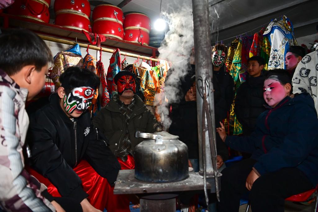 3月2日,陇县黄花峪村社火队队员在相互交流。新华社记者 邹竞一 摄