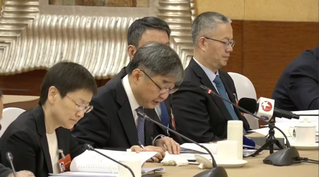 3月6日上午,2026年全国两会期间,上海代表团举行开放团组会议,丁奎岭(左二)正在发言中。