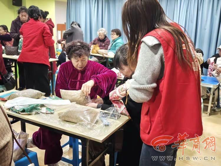 手工制作环节,社区工作者刻意规避了“老师台上讲、学员台下跟”的传统教学模式。幼儿园的活动桌被拼成几个小组,便于邻里面对面交流;材料包分发后,社区工作人员做安全提示,老师做现场指导,具体的缝制技巧鼓励大家“互通有无”。很快,几位擅长女红的阿姨脱颖而出,自然而然地成为“临时导师”。“来,我教你,艾草要先揉一揉再装进去,这样枕头更蓬松,药效也散发得更好。”“你那个绳子太紧了,放松一点,缝出来才好看。”——这种基于平等关系的同伴教育,比任何自上而下的教学都更有效。