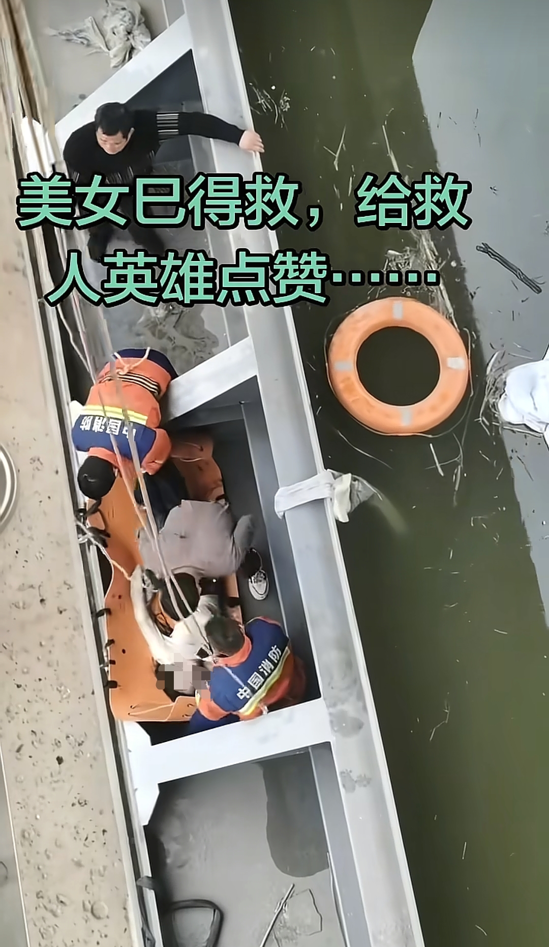 网友拍摄的多段视频显示,河道闸口的水流湍急,一名黑衣男子跨坐在拦水闸上,救助一名落水女子,该女子的面部浸泡在河水中。另一段视频中,消防救援人员在现场展开救助,他们将女子抬到救生垫上,黑衣男子在一旁帮忙协助。
