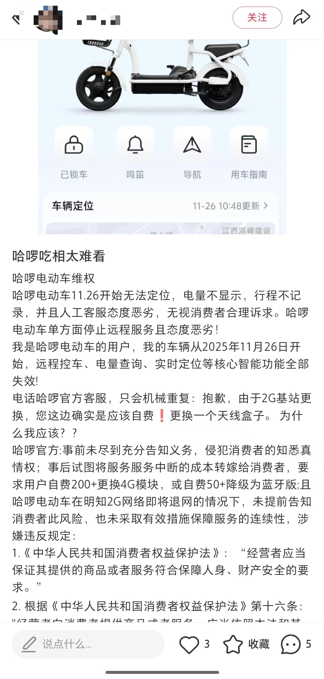 然而,记者在社交平台上发现,有不少消费者有类似遭遇。他们反映自己的远程控车服务早在2025年11月26日便被突然中断,是哈啰电动车单方面停止远程服务。还有消费者质疑哈啰未尽到充分告知义务,认为公司将本应自行承担的服务运营成本,通过“掐断服务”的方式转嫁给了消费者。
