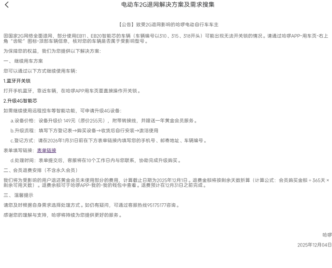 根据公开信息,2025年12月4日,哈啰品牌方曾发布《致受2G退网影响的哈啰电动自行车车主》的公告。其中提到,因国家2G网络全面退网,部分使用EB11、EB20智能芯的车辆可能出现无法开关锁的情况,对此哈啰提供两种解决方案,一是继续使用车辆,但用户如希望继续使用远程控车等智能功能,则需支付149元申请升级为4G设备;二是申请退费。哈啰将为受影响的用户退还黄金会员未使用部分对应的费用,退费计算截止日期为2025年12月1日,但永久会员不在此次退费范围之内。