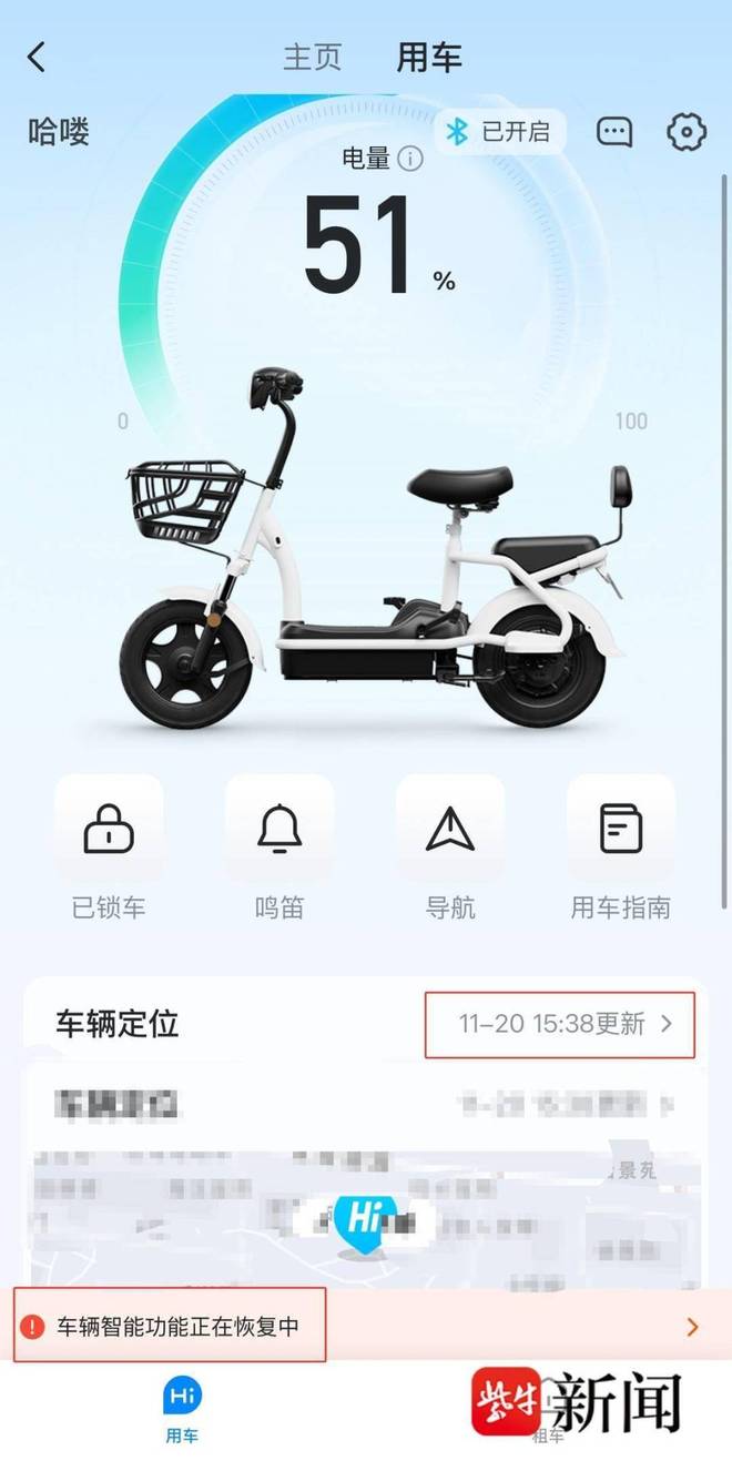 2025年11月,姚先生再次发现车辆出现异常,定位、远程开锁、电量显示等多项黄金会员功能均无法使用。由于这辆车没有机械钥匙锁,现在只能走到车旁通过蓝牙近距离解锁,电量和定位信息也不再更新,一直停留在去年,给他的日常使用带来不少麻烦。