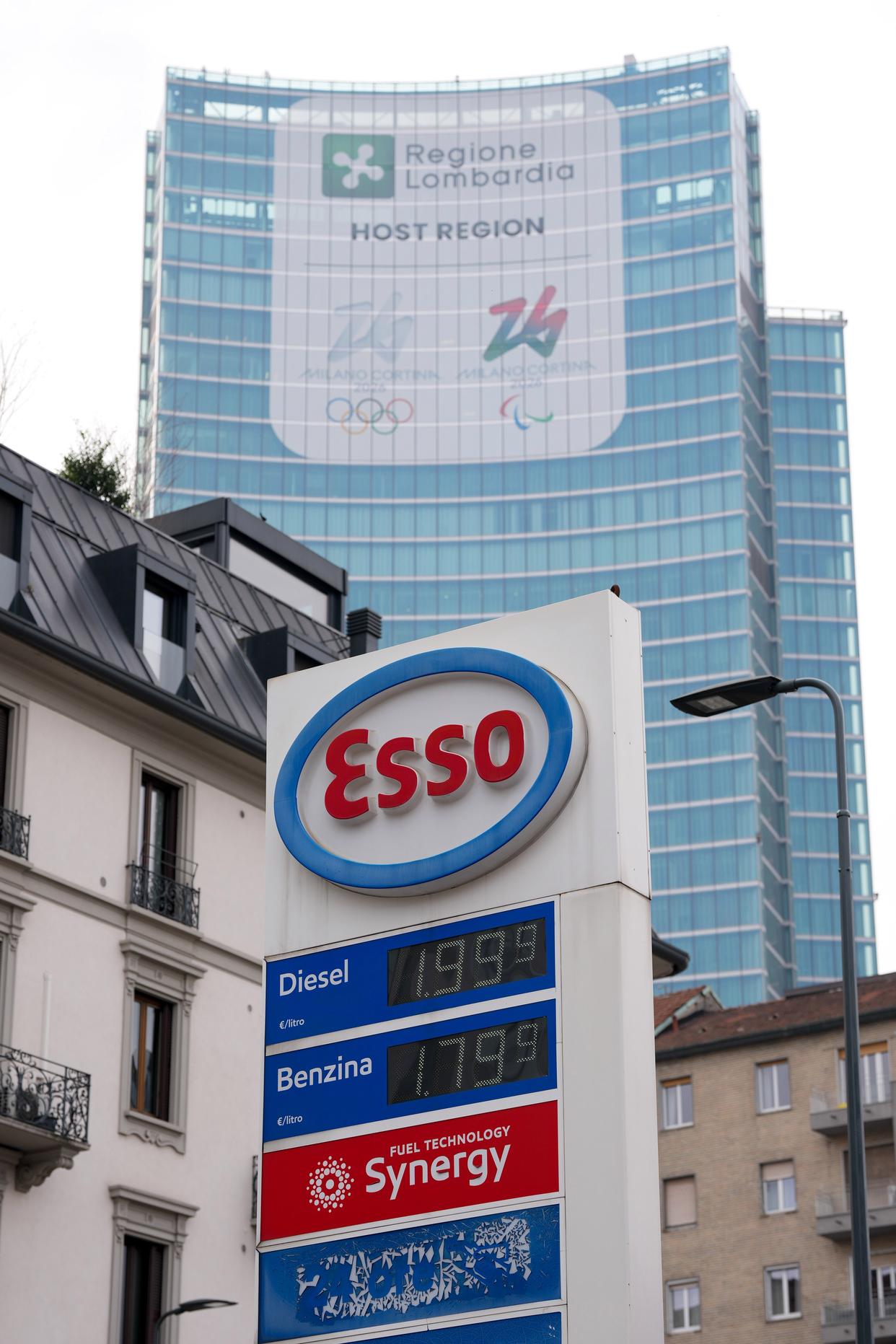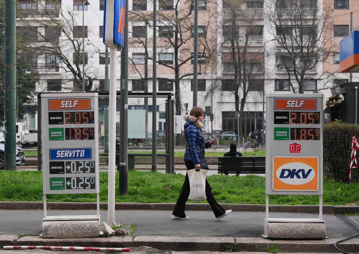 这是3月11日在意大利米兰市中心拍摄的一家加油站的油价牌。新华社记者 李京 摄