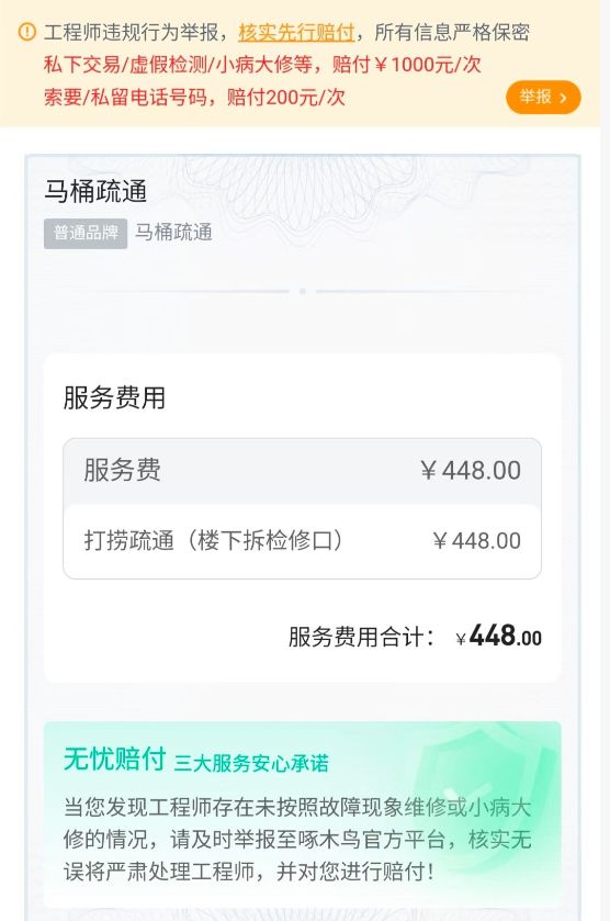 消费者杨女士也有类似经历。2月18日,因家中马桶堵塞,她在啄木鸟平台下单了马桶疏通服务,在未对马桶堵塞情况详细了解的情况下,维修师傅给出了448元的报价,其中100元为春节服务费。