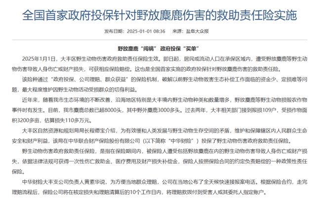 据悉,2025年,盐城市政府曾发布“全国首家政府投保针对野放麋鹿伤害的救助责任险实施 ”一文,政府投保为野放麋鹿“闯祸”进行“买单”。