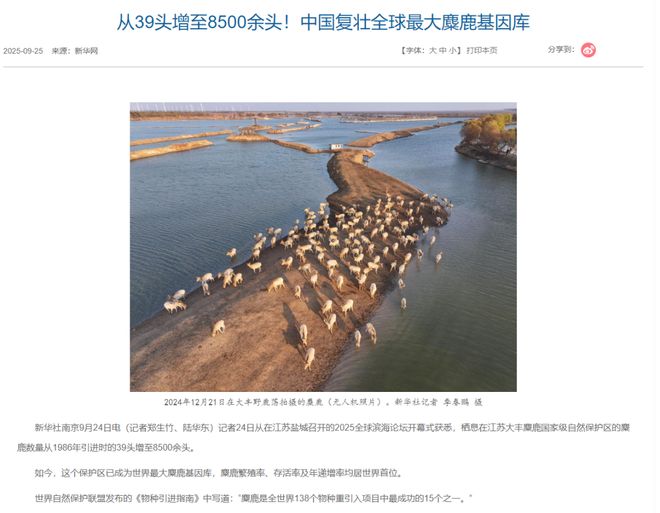 1986年 , 江苏大丰建立国家级麋鹿自然保护区 ,历经多年,2025年新华网数据显示, 栖息在江苏大丰麋鹿国家级自然保护区的麋鹿数量从1986年引进时的39头增至8500余头。