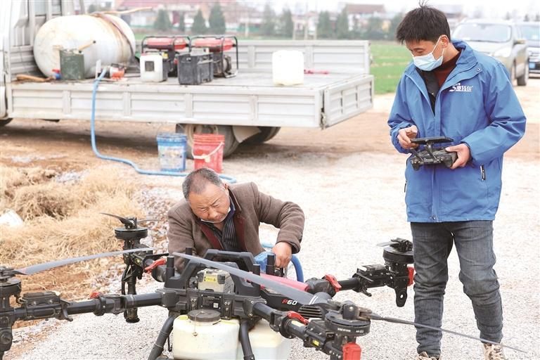 村民为无人机添加小麦叶面肥料。