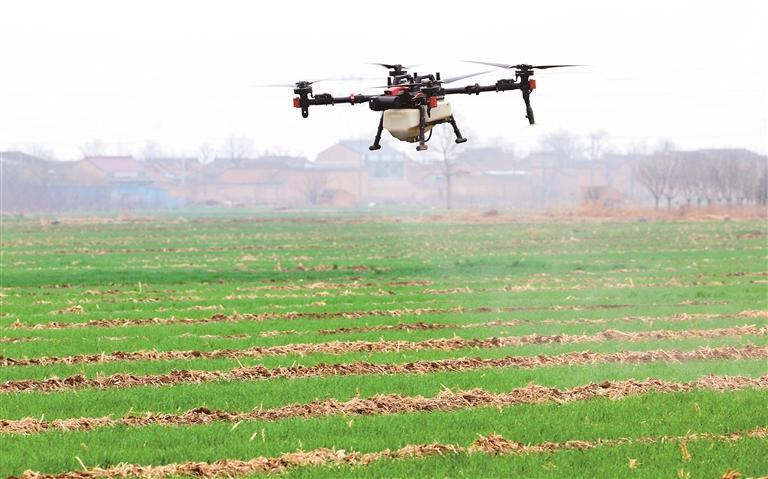3月4日,关中平原乍暖还寒。在陕西省咸阳市乾县城关街道新巨洲村的连片麦田里,绿油油的冬小麦已进入返青期,一架植保无人机低空穿梭,为即将进入拔节期的麦苗 “加餐补营养”。