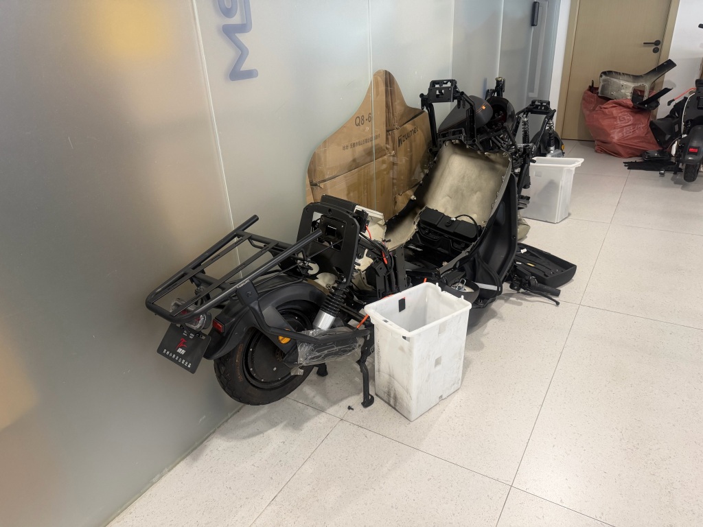 记者此后在公司大厅看到,现场零星摆着几辆被拆解的电动自行车和一些零部件,角落处电动自行车框架仍在,未见电池。此外,多名市场监管部门的执法人员仍在现场取证。