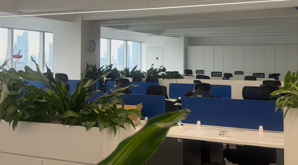 公司大厅几十个工位,但空无一人。
