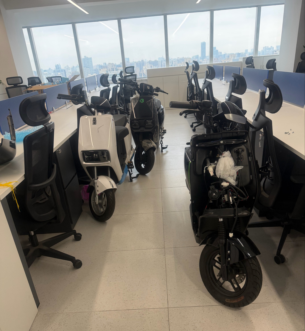 公司大厅停放着几辆电动车。