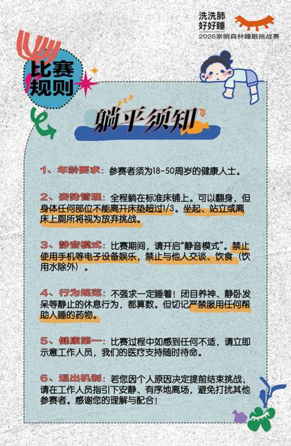 据“上海崇明”近日发布消息,“2026崇明森林睡眠挑战赛”将于3月21日至4月26日每周六、5月2日、5月3日举办,每天各一场,每天50人参赛,报名费299元。参赛者唯一的“KPI”是睡到自然醒,睡眠得分最高者将获得3000元奖金,最快进入睡眠状态的人将获得2000元奖金,所有严格遵守规则并坚持到最后的选手共同瓜分万元大奖。主办方将统一提供专业的睡眠监测仪器,选手需要按要求佩戴,奖项评定以仪器记录的客观数据为最终依据。
