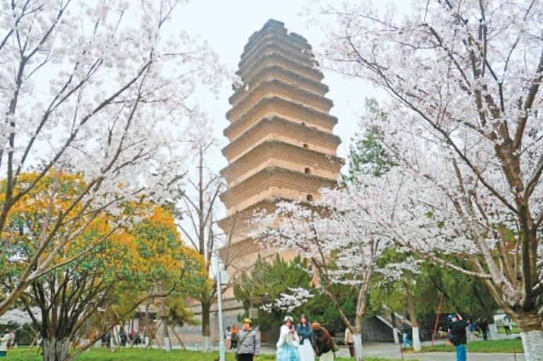 小雁塔下的樱花吸引市民游客打卡。 记者 谢伟 摄