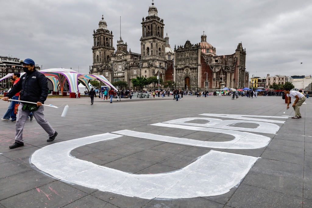 2026年2月22日,墨西哥墨西哥城,社会组织成员在城市主广场宪法广场绘制标语,以声援古巴,抗议美国对古巴实施的石油禁运。视觉中国 图