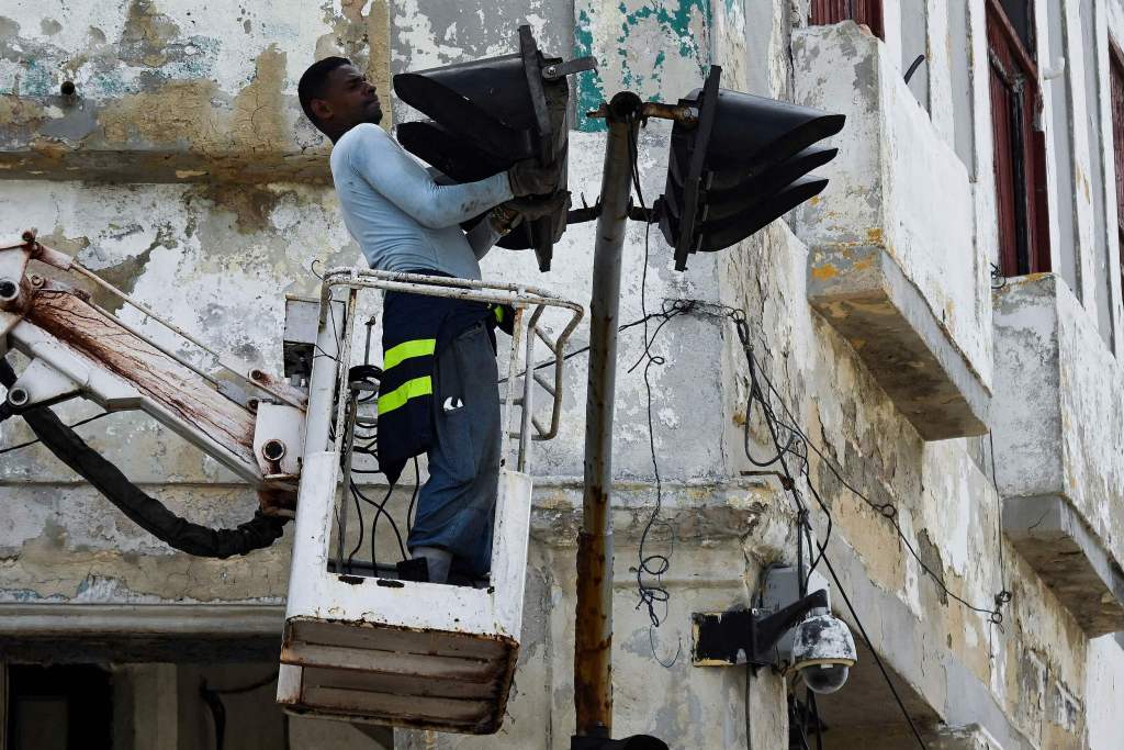 2022年9月29日,古巴哈瓦那,在强飓风“伊恩”过境后,一名男子在修理红绿灯。此前古巴经历了超过12个小时完全停电。视觉中国 图