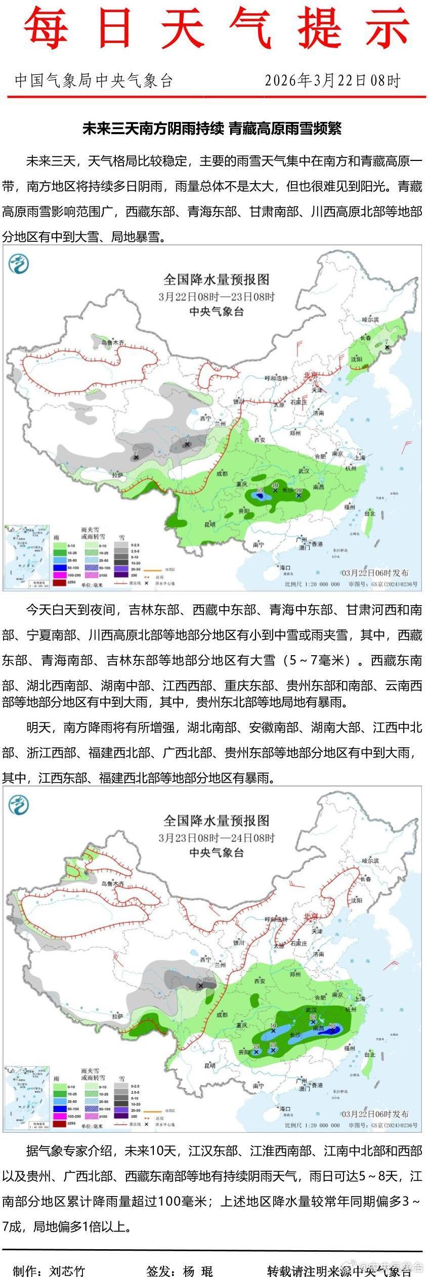 据中央气象台3月22日消息,未来三天,天气格局比较稳定,主要的雨雪天气集中在南方和青藏高原一带,南方地区将持续多日阴雨,雨量总体不是太大,但也很难见到阳光。青藏高原雨雪影响范围广,西藏东部、青海东部、甘肃南部、川西高原北部等地部分地区有中到大雪、局地暴雪。