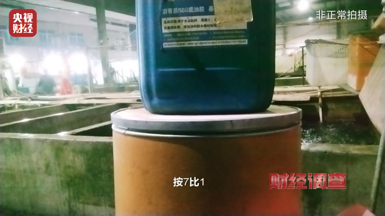 工人手中的这些液体瓶上写着“鱼护宝”,鱼用安定剂,成分丁香酚,属无生产日期、无生产厂家、无生产许可证的“三无”产品。