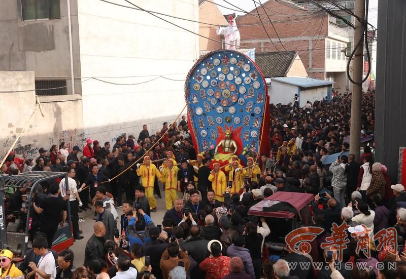 活动现场人头攒动、欢声雷动,成为一片欢乐的海洋。作为周至特色非遗民俗,哑兴村社火阵容盛大、技艺精湛,其中最具看点的便是哑兴村独有的县级非遗——玄武焰光(又称青器焰光),该非遗于2008年列入县级非遗名录,也是社火展演的压轴大戏。这一焰光造型极为震撼,主体是七八米高的椭圆屏,屏身贴有36幅佛像与八仙图,环板上有18套青瓷碗碟叠粘而成,搭配108面圆镜,顶端设有戏曲造型,正中是无量寿佛的金粉扮相,精致又大气。其技艺更为独特,采用秘制鳔胶固定所有瓷件,使得瓷件悬而不坠且可灵活旋转;底部用碾盘、碌碡配重,由数十名壮汉分三组扛抬,再用四条大绳“扯纤”保持平衡,尽显古朴匠心。据悉,玄武焰光源自西凉古傩祭,融合了丝路文化,寓意着风调雨顺、平安富足,每一次亮相都引得围观群众阵阵喝彩,大家纷纷拿出手机记录这震撼瞬间。