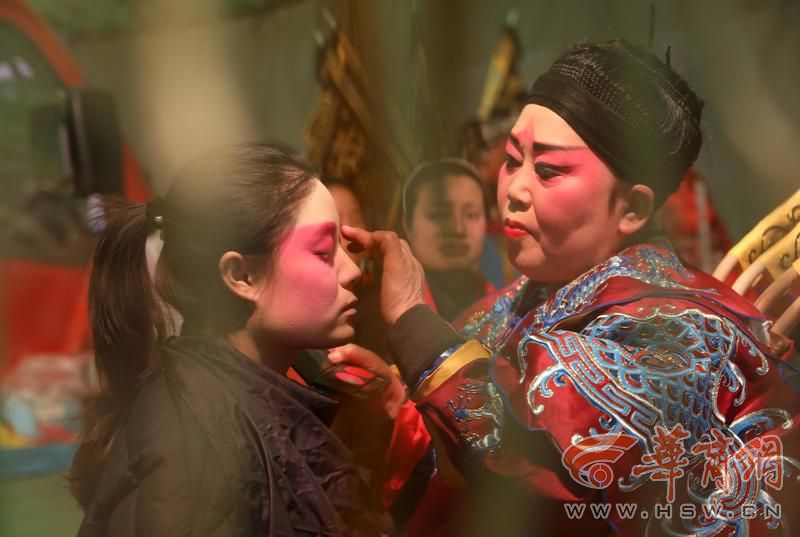 3月20日,记者早晨8点多赶到哑兴村。村里还特意搭起戏台,唱响经典秦腔大戏。早晨演出的是秦腔经典剧目《金沙滩》,秦腔演出的现场已经坐了数百位观众等候着大戏开演。后台周至秦艺演出有限公司的演员们正在精心化妆,9点大戏准时开演,演员们唱腔铿锵,将剧中人物的家国情怀演绎得淋漓尽致,舞台下看戏的人越来越多,将舞台前围得水泄不通,到高潮处戏迷们不时鼓掌喝彩、点头称赞。