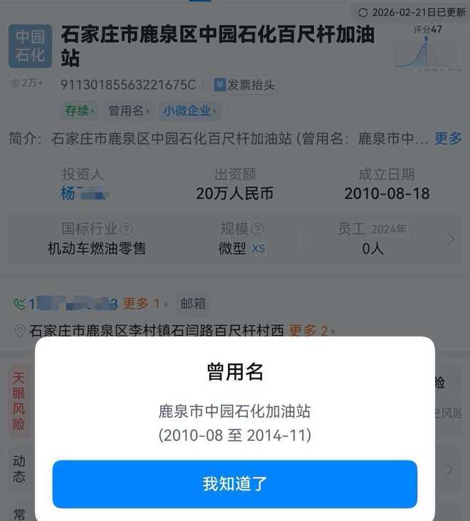 不过,记者查询天眼查显示,该加油站为石家庄市鹿泉区中园石化百尺杆加油站,曾用名为鹿泉市中园石化加油站。