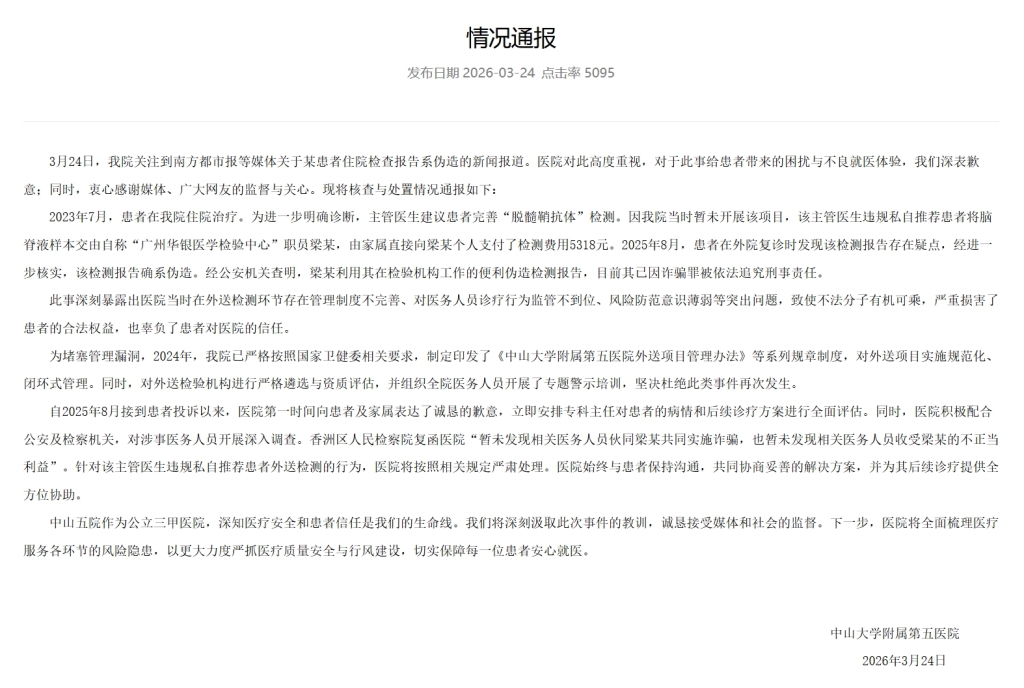 华商网讯 3月24日,中山大学附属第五医院发布情况通报称,24日,该院关注到南方都市报等媒体关于某患者住院检查报告系伪造的新闻报道。医院对此高度重视,对于此事给患者带来的困扰与不良就医体验,我们深表歉意;同时,衷心感谢媒体、广大网友的监督与关心。现将核查与处置情况通报如下: