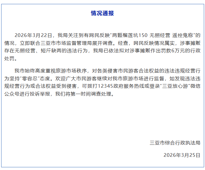2026年3月22日,我局关注到有网民反映“两颗榴莲坑150 无照经营 遥控鬼称”的情况,立即联合三亚市市场监督管理局展开调查。经查,网民反映情况属实,涉事摊贩存在无照经营、短斤缺两的违法行为,我局已依法拟对涉事摊贩作出罚款6万元的行政处罚。