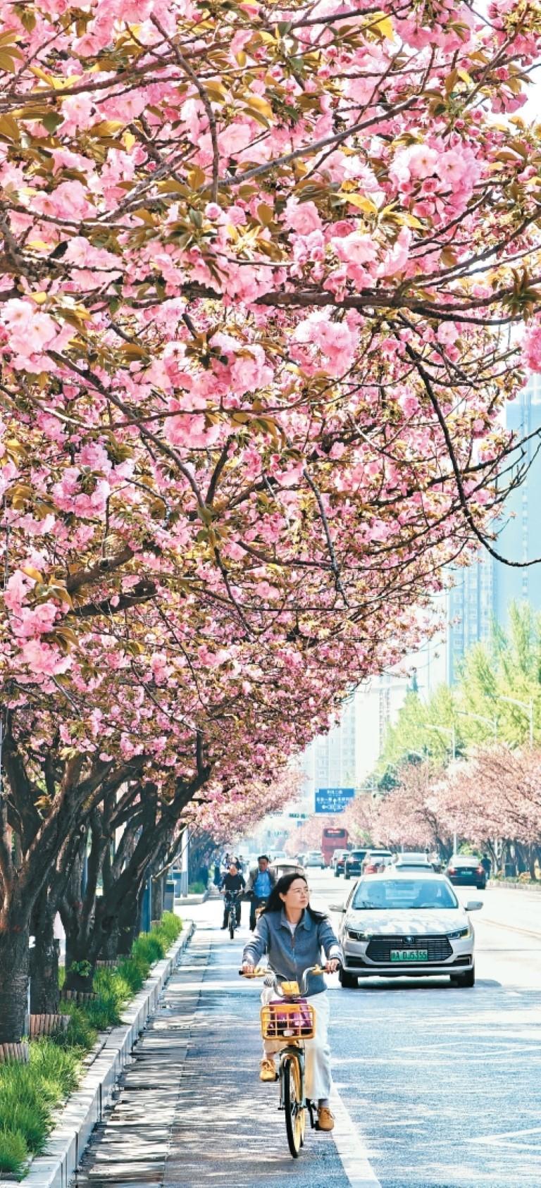 4月1日,西安高新二路樱花、海棠花、紫藤花陆续盛开,繁花似锦。