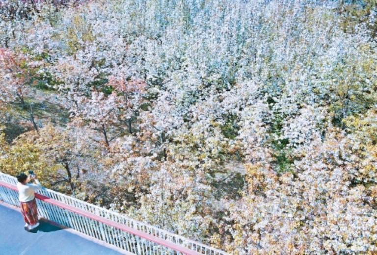 4月1日,西安南郊雁南公园的梨花竞相绽放,游客在栈桥上观赏拍照。