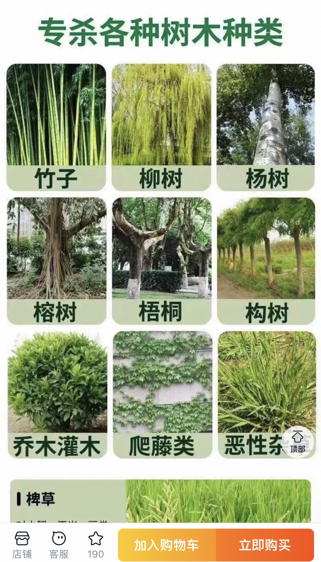 该店客服向记者表示,这款产品为“强效微生物添加剂”,不仅能除草,对老树根、竹子等。植物也能起效。使用方法为直接将产品倒入树根部,“三个月树就枯萎了”
