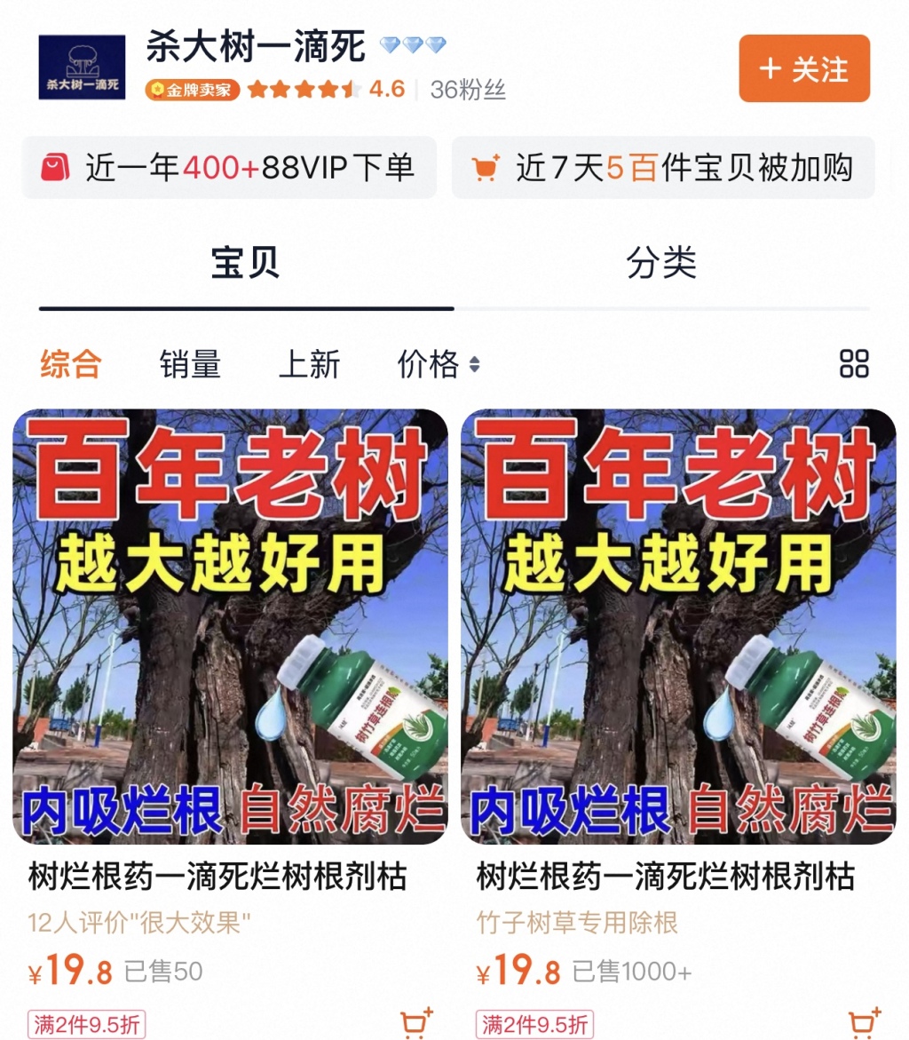 一家名为“杀大树一滴死”的淘宝店铺,正在销售一款名为“枯树王”的产品,单价19.8元,显示已售出超过1000件。产品宣传页称,该药为“林用除草剂”,对大树、竹子、杂草均有极大杀伤性,可通过浇根或喷洒方式使用,并配以“叶枯萎,烂根部”“老树连根烂,一滴枯千里”等宣传语。