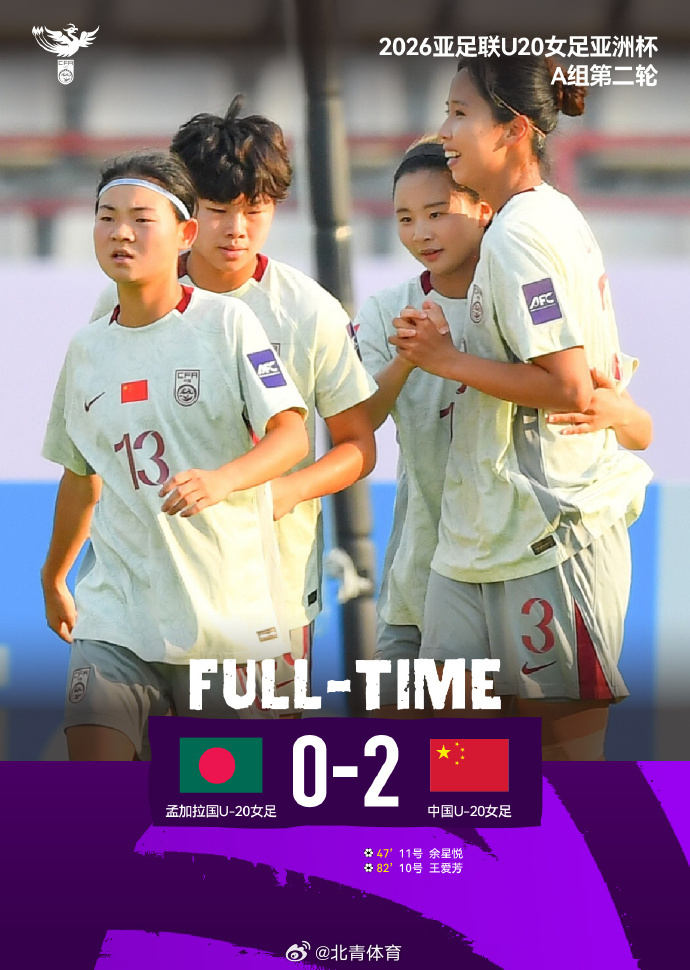 下半场中国队终于打破僵局。第47分钟,曾雨佳右路突破传中,余星悦门前包抄得分。第82分钟,王爱芳任意球大力攻门再下一城,为中国队锁定胜局。