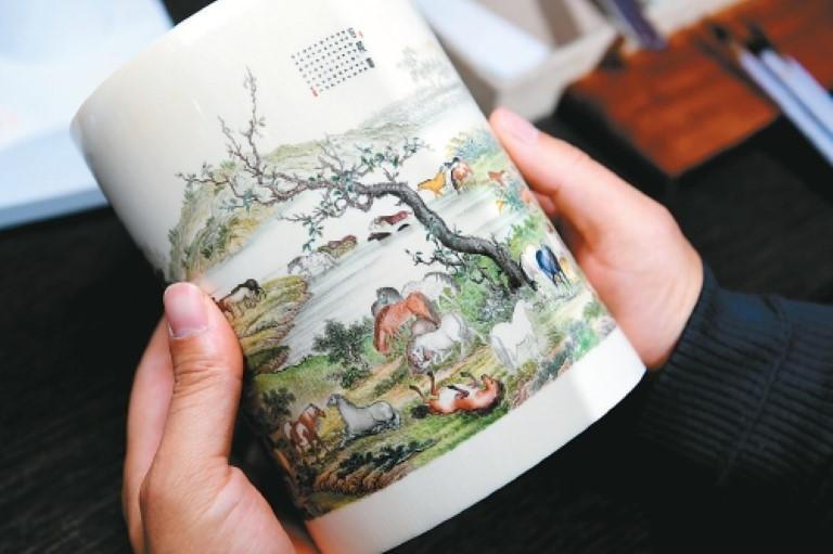 潜心创作中的卢彦卓,在笔筒上雕琢出栩栩如生的骏马图案。