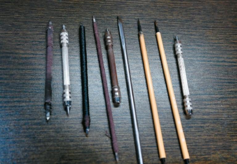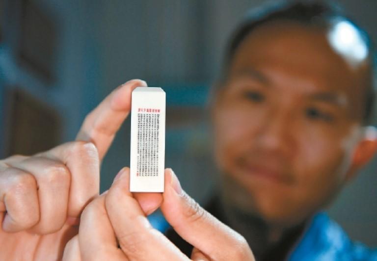 微雕创作之路充满挑战,没有适配的现成工具,他便根据材质特性自行打磨,多年间制作数百把刻刀,最终沉淀出趁手的专用刀具。他也从一味追求极致缩小尺寸,转向“微中见艺”,在细节、技法、色彩搭配上精益求精。依托西安深厚的文化底蕴,他在印章、笔筒、镇尺等文房器具上雕刻,融入青铜器、唐三彩等陕西特色文化元素,让作品成为地域文化的微型载体。
