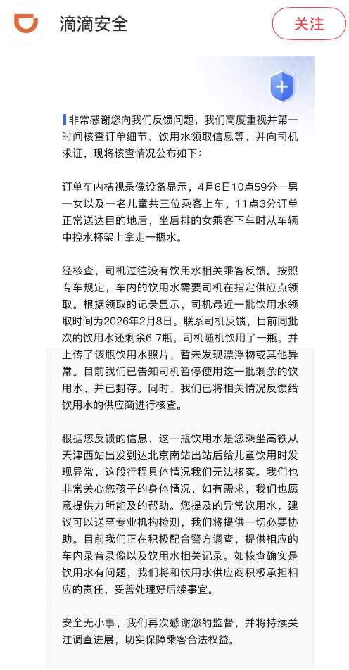 4月6日晚,滴滴在社交平台发布此事的核查情况:订单车内桔视录像设备显示,4月6日10点59分一男一女以及一名儿童共三位乘客上车,11点3分订单正常送达目的地后,坐后排的女乘客下车时从车辆中控水杯架上拿走一瓶水。