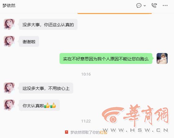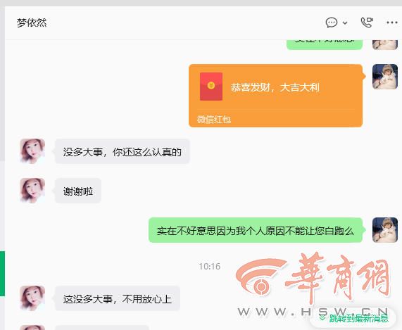 “起初姐姐一直没领红包,只是还回消息夸我做事认真,我就一遍遍的看信息,直到看到她收了红包,心才定下来,感谢陈姐,感谢《华商报》!”