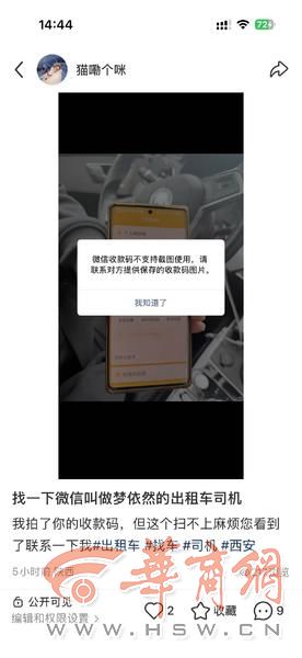 “你好,我早上打车时没支付成功,拍了驾驶员姐姐的支付码,可有网后一直付不了,能麻烦帮我找到这位好心的的姐吗?”22岁女孩小孙致电华商报新闻热线029-88880000求助。