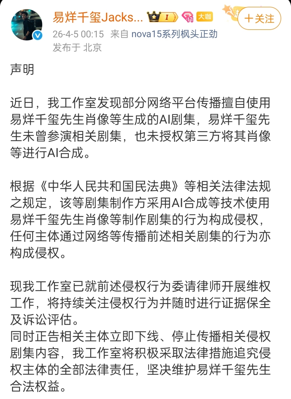 4月5日,易烊千玺工作室发布声明称,近日,工作室发现部分网络平台传播擅自使用易烊千玺先生肖像等生成的AI剧集,易烊千玺先生未曾参演相关剧集,也未授权第三方将其肖像等进行AI合成。根据民法典等相关法律法规之规定,该等剧集制作方采用AI合成等技术使用易烊千玺先生肖像等制作剧集的行为构成侵权,任何主体通过网络等传播前述相关剧集的行为亦构成侵权。