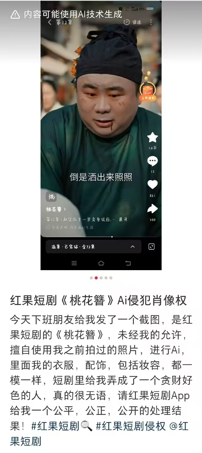 但对于被侵权人来说,这种侵犯又具有隐蔽性和不确定性。马兴军表示,因AI生成量大,往往很难发现自己被侵权,在《桃花簪》事件中,被侵权人的朋友看到他的照片,在机缘巧合下,才得知被盗用形象,而很多人可能并未发现自己被侵权了。