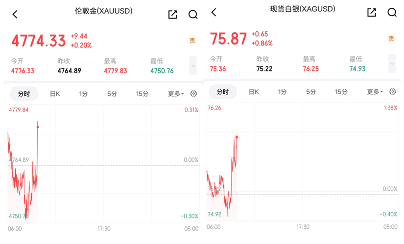 昨日黄金和白银价格出现温和上涨,整体贵金属板块在风险偏好回暖背景下获得支撑。今日短暂下跌后开启上涨,截至发稿,现货黄金涨 0.20 %,报4774.33 美元;现货白银涨 0.86%,报 75.87 美元。