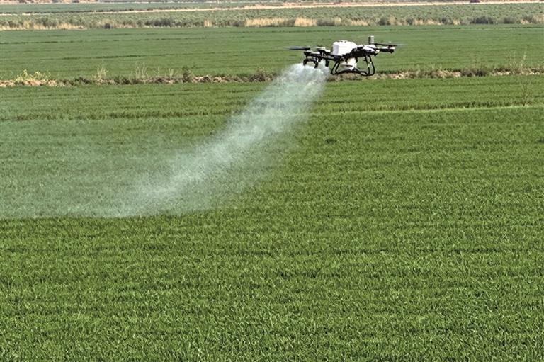 近期,大荔县55.9万亩小麦进入“一喷三防”田间管理工作关键期。图为无人机在东城街道麦田进行“一喷三防”作业(4月10日摄)。