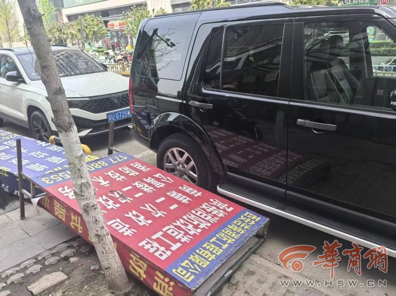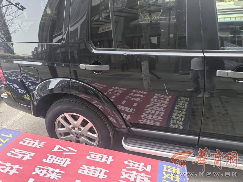 从王先生提供的现场照片、视频看,车辆为一辆黑色路虎车,车窗玻璃下方有明显伤痕,地上横躺着广告牌,广告牌上写着“西安浩海消防工程有限公司”、“承接消防改造工程”、“商铺二次改造”、“公寓楼二次改造”、“消防技术服务”等信息。