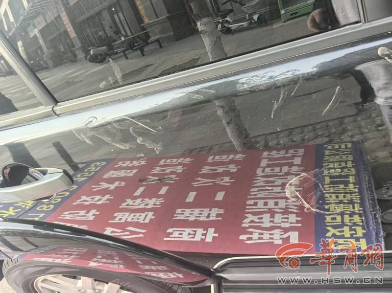 4月10日,车主王先生向华商报反映,他是西安市三桥附近华润二十四城的业主,“4月2号晚,我把车停在小区内部的停车位上,4月3号中午12点多,我要出门,准备开车,刚走到车旁边,发现车被广告牌砸了,车窗玻璃下方有明显伤痕,广告牌躺在车旁边。广告牌有对应的门店,但找不到人。我给广告牌上的电话打电话,对方不认为他有责任。”