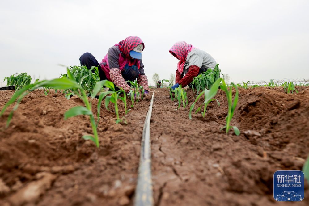 ↑ 4月9日,河北省唐山市丰南区大新庄镇薄庄村农民在田间移栽水果玉米苗。新华社发(李秀清摄)