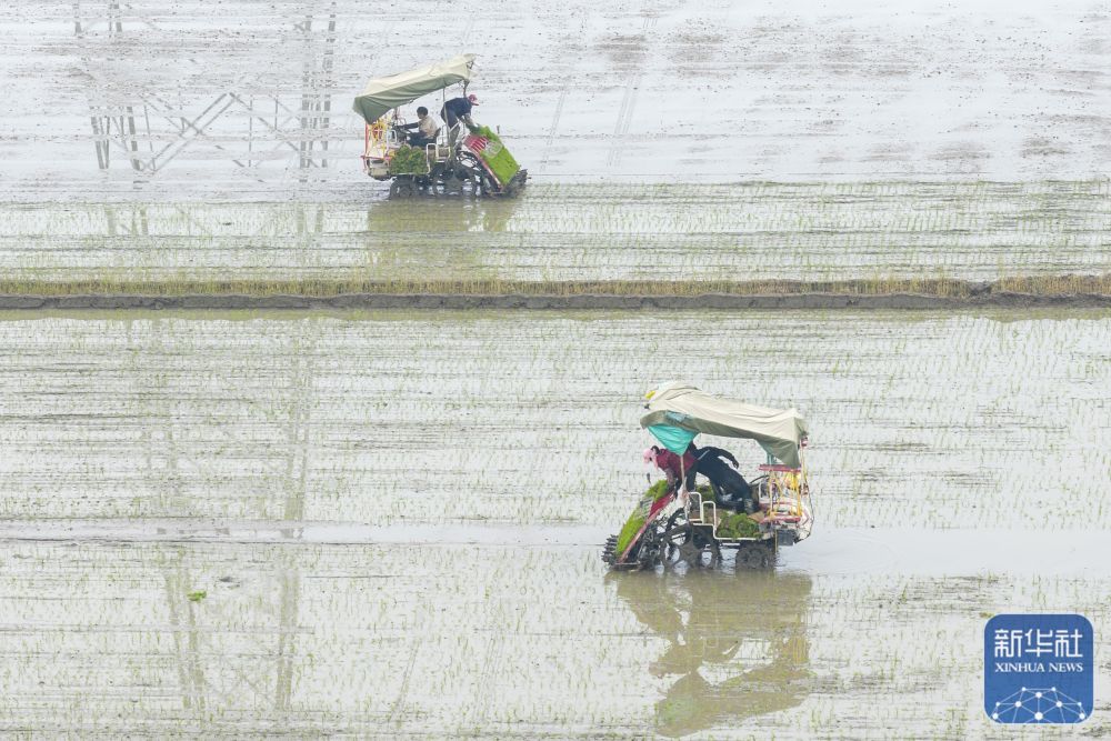 ↑ 4月9日,江西省九江市都昌县汪墩乡细桥村,农民驾驶插秧机进行插秧作业(无人机照片)。新华社发(傅建斌摄)