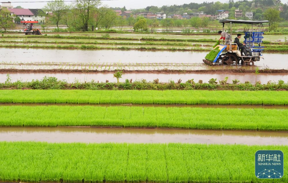 ↑ 4月11日,湖南省衡阳市祁东县金桥镇村民驾驶插秧机进行早稻插秧工作。新华社发(曹正平摄)