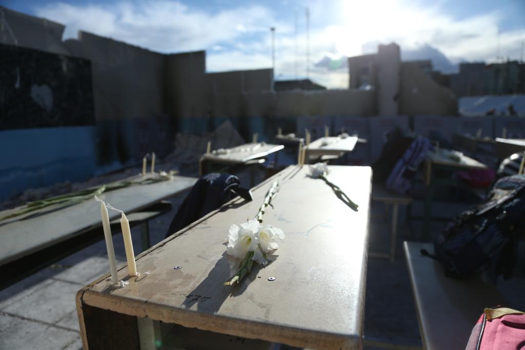 4月6日,在伊朗首都德黑兰市举行的悼念活动现场,组织者搭建起小学教室遭袭场景并在课桌上摆放鲜花,悼念遭美以空袭遇难的米纳卜小学学生。新华社记者 沙达提 摄