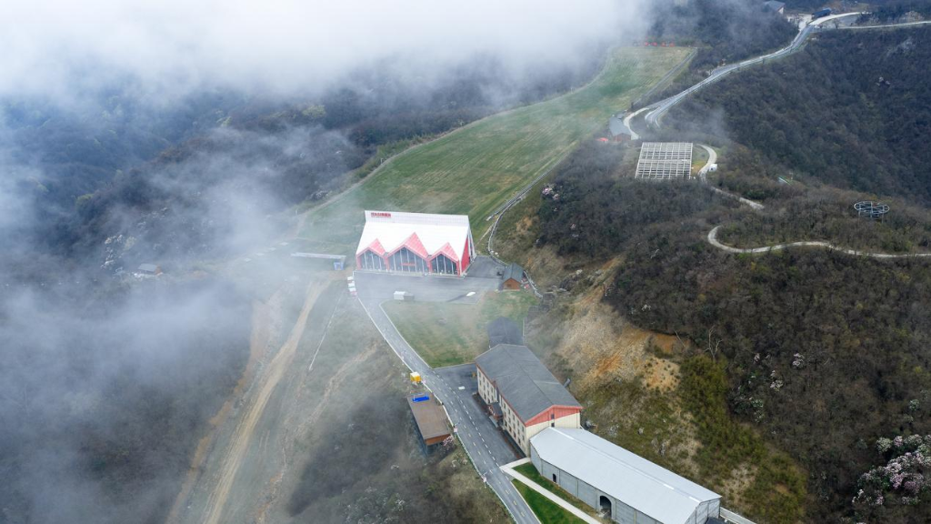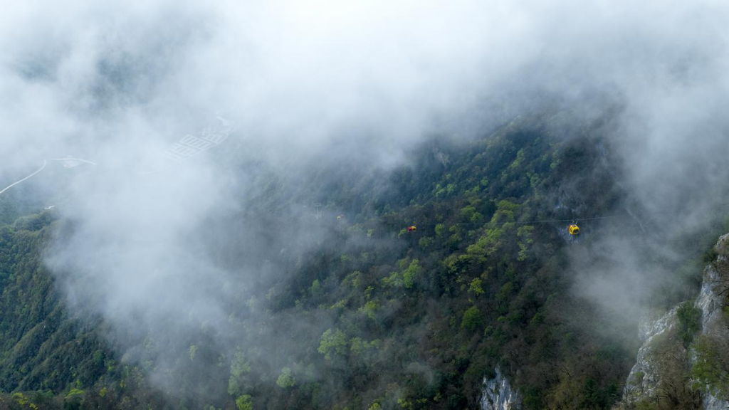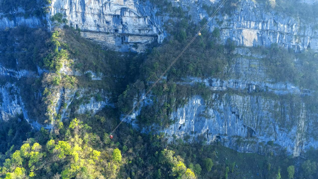 龙头山绝壁索道穿行于悬崖间,轿厢在春日山林间穿梭。