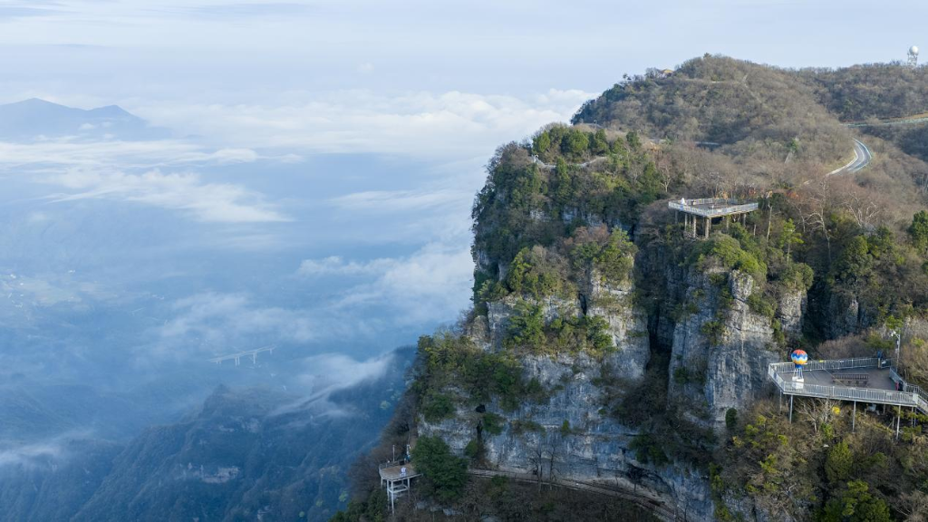 龙头山悬崖观景台凌空而立,云海在山谷间翻涌。