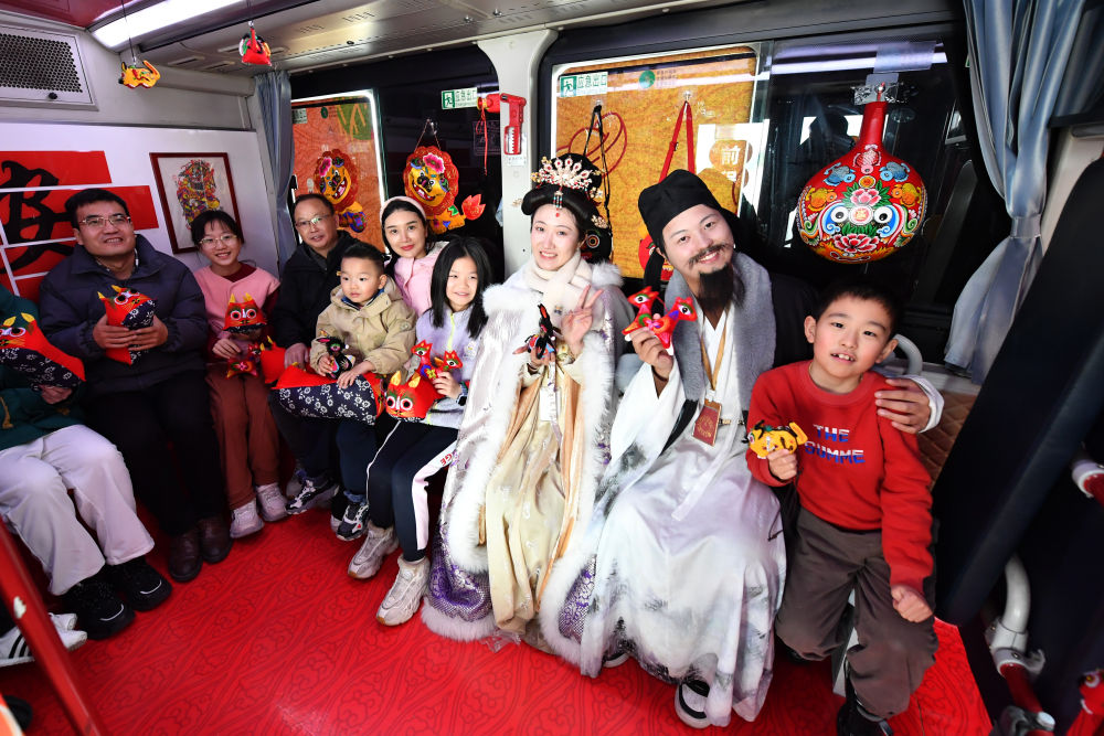 2025年1月30日,在西安城市观光车上,扮演李白、杨贵妃的工作人员与游客合影。新华社记者 邵瑞 摄